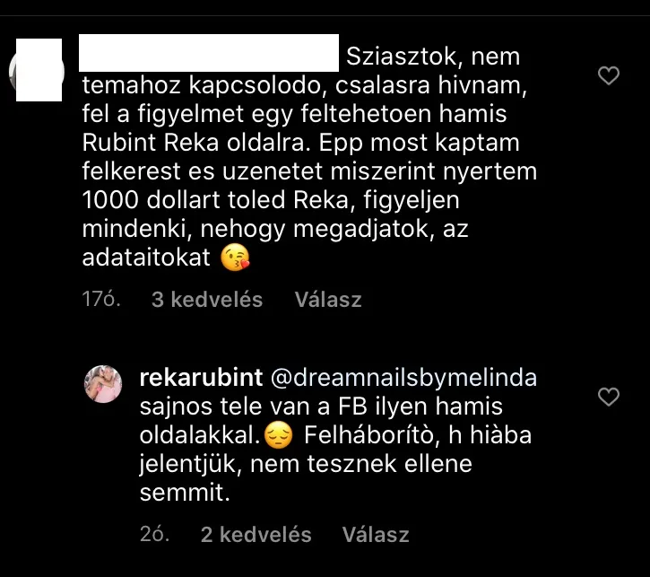 „Csalásra hívnám fel a figyelmet, egy feltehetően hamis Rubint Réka oldalra. Épp most kaptam felkérést és üzenetet, miszerint nyertem ezer dollárt tőled Réka. Figyeljen mindenki, nehogy megadjátok az adataitokat” – írta a hölgy.
