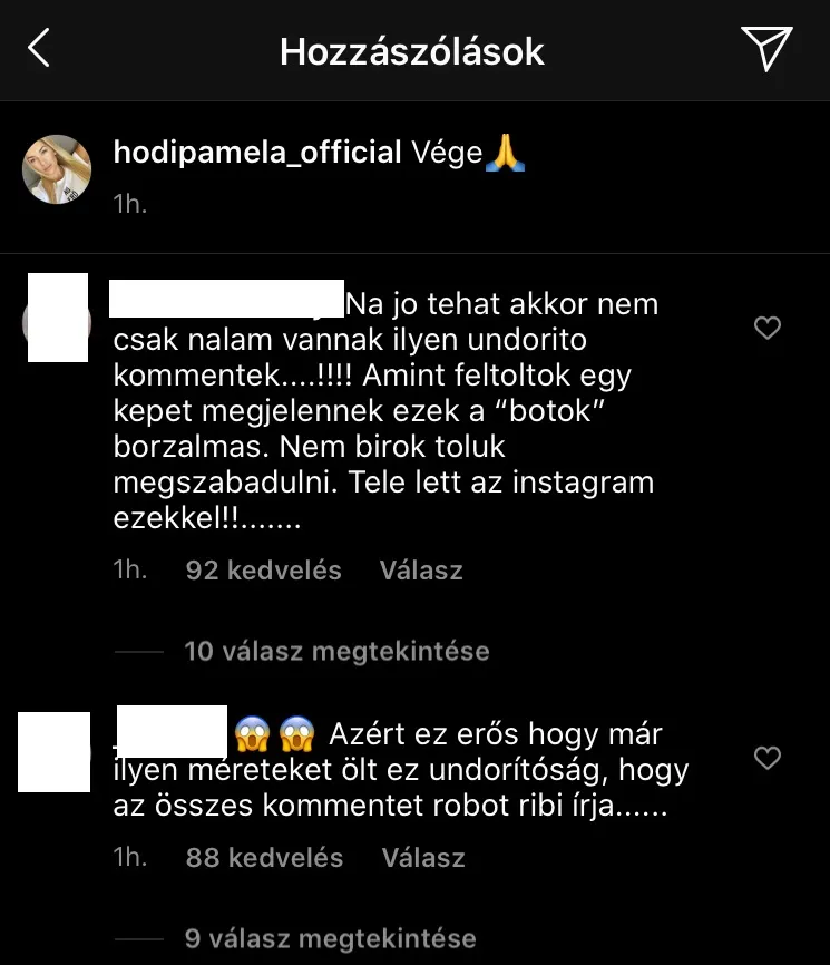 Miután boldogan számolt be a sztáranyuka, hogy meggyógyult a koronavírusból, rögtön meg is bánta, hogy posztolt. Közel tíz robotribi támadta meg a fotóját, és nyomdafestéket nem tűrő szavakkal árasztották el a bejegyzését. Pamela gyorsan törölte is a kommenteket, ám a rajongók teljesen kiakadtak. Talán még jobban, mint Pamela... „Jézusom, mik ezek a kommentek? Állítsd be valahogyan, hogy a pornós valakik ne tudjanak írni. Engem idegesít rendesen” – fogalmazta meg az egyik követője. Más pedig azt írta, ha nem tesz ellene valamit, nem követi tovább.