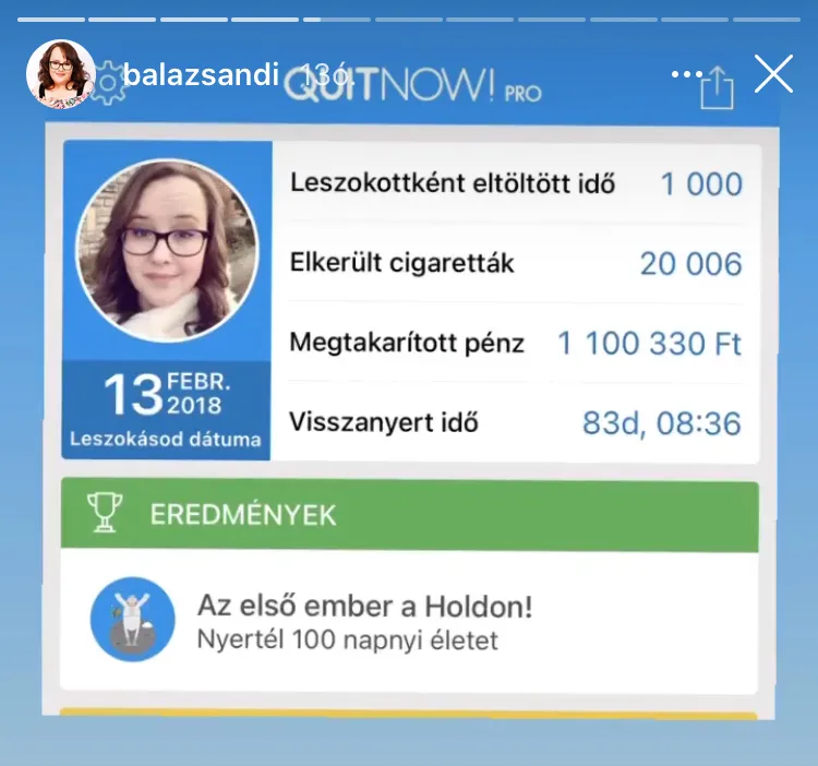 „Füstmentes élet. Meglehet csinálni. Senki nem segített” – írta Andi, aki azt is bevallotta, hogy külső segítség nélkül szokott le, annak ellenére is, hogy eleinte sokszor nehéz volt megállnia, hogy újra bűnbe essen.