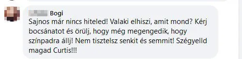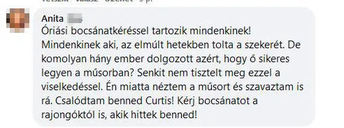 „Óriási bocsánatkéréssel tartozik mindenkinek! Mindenkinek, aki az elmúlt hetekben tolta a szekerét. De komolyan, hány ember dolgozott azért, hogy ő sikeres legyen a műsorban? Senkit nem tisztelt meg ezzel a viselkedéssel. Én miatta néztem a műsort és szavaztam is rá. Csalódtam benned Curtis! Kérj bocsánatot a rajongóktól is, akik hittek benned!” – írta az egyik rajongója.