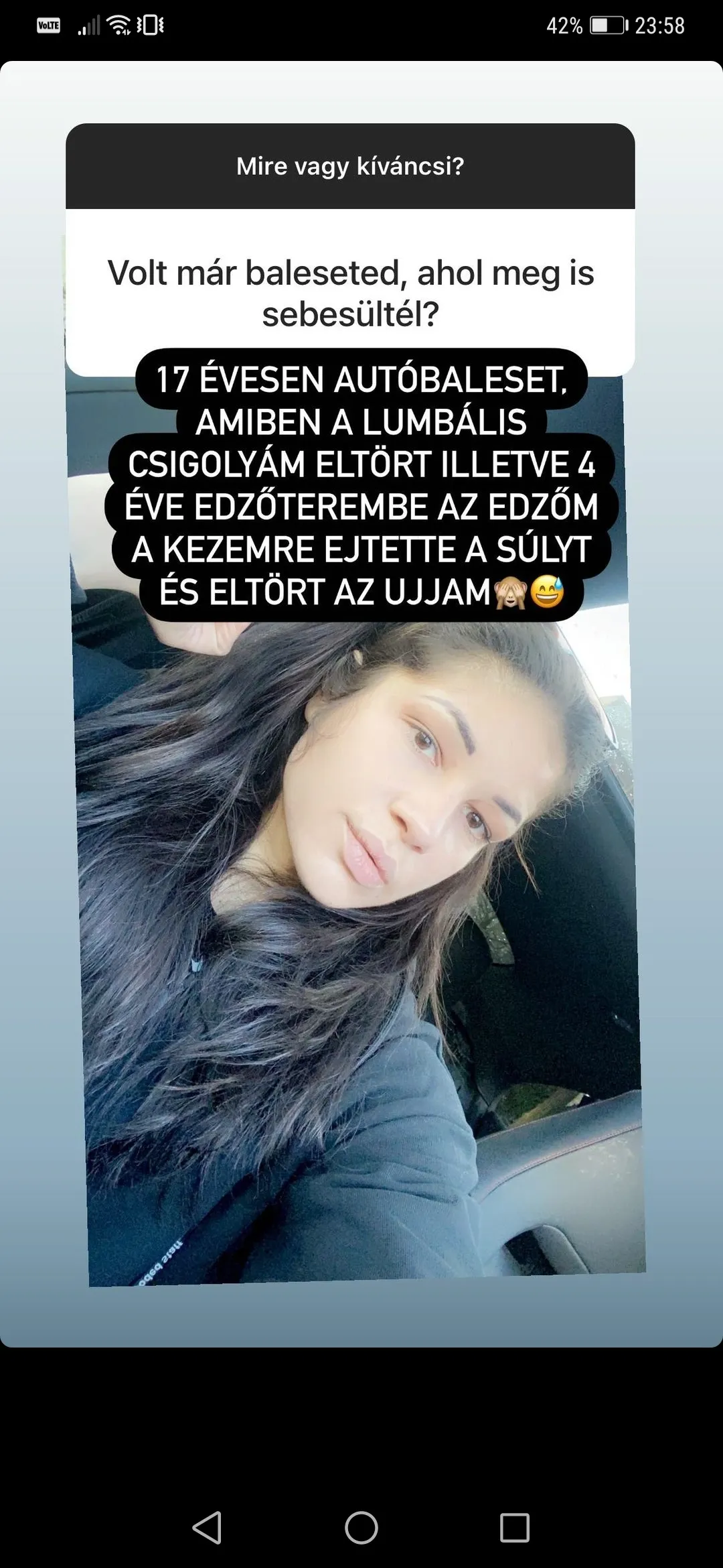 Gáspár Evelin egy követője kérdésére bevallotta, évekkel ezelőtt balesetet szenvedett, melyben komolyan megsérült.