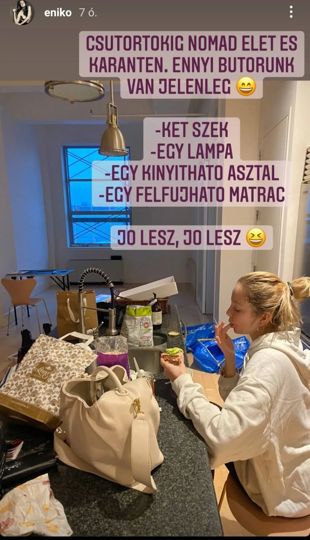 A békéscsabai születésű magyar modell nemrég költözött vissza az Egyesült Államokba, a koronavírus-járvány miatt pedig egészen csütörtökig házi karanténban kell lennie. Két szék, egy lámpa, egy kinyitható asztal, egy felfújható matrac, és természetesen a kedvese társaságában.