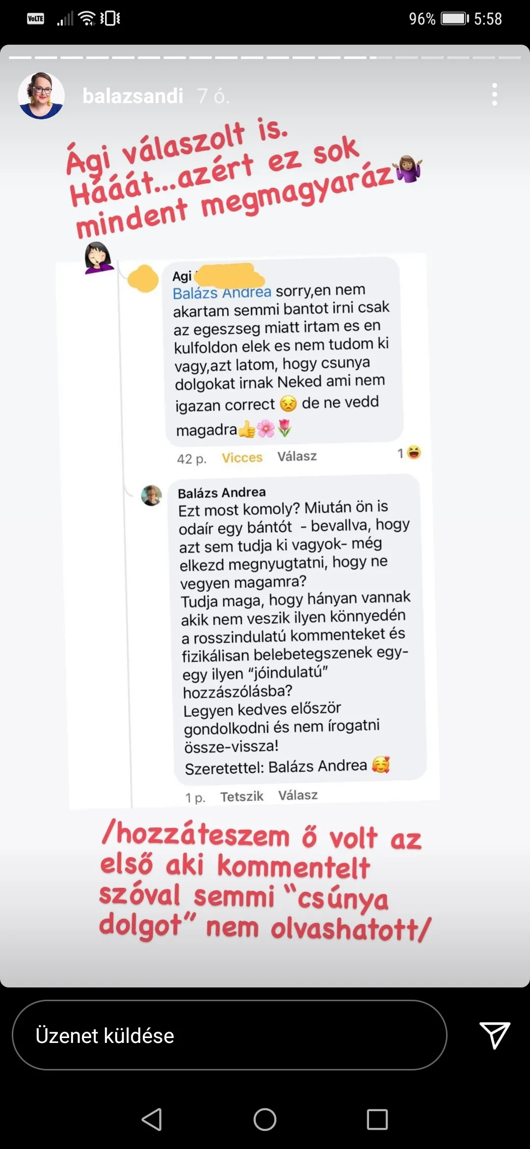 „Ez most komoly? Miután ön is odaír egy bántót – bevallja, hogy azt sem tudja, ki vagyok – még elkezd megnyugtatni, hogy ne vegyem magamra? Tudja maga, hogy hányan vannak, akik nem veszik ilyen könnyedén a rosszindulatú kommenteket és fizikálisan belebetegszenek egy-egy ilyen „jóindulatú” hozzászólásba? Legyen kedves először gondolkodni” – szögezte le Balázs Andi.