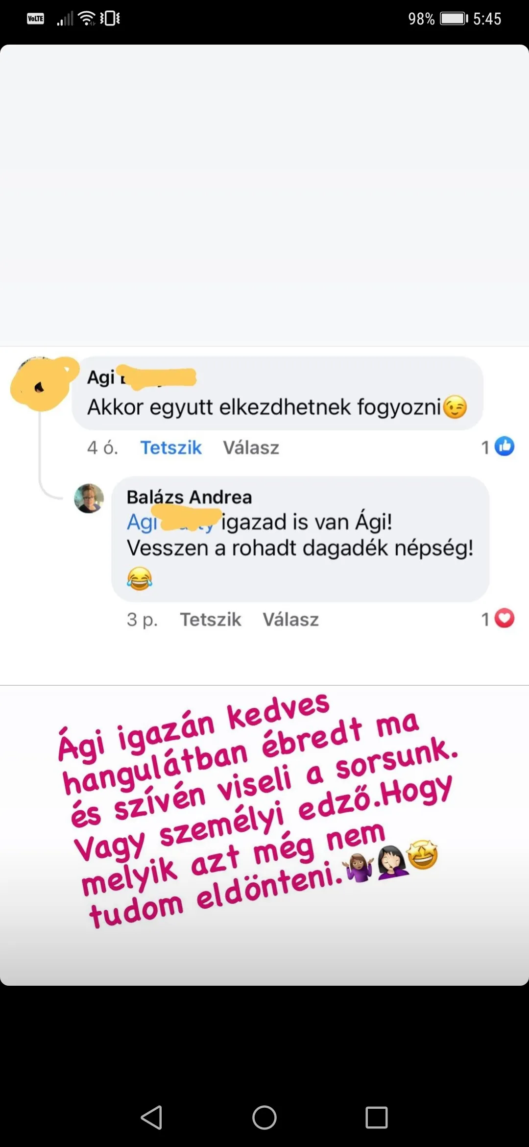 „Akkor együtt elkezdhetnek fogyózni” – írta egy kommentelő, de Andinak se kellett több, először humorral vágott vissza. „Igazad is van Ági! Vesszen a rohadt dagadék népség” – írta a színésznő.
