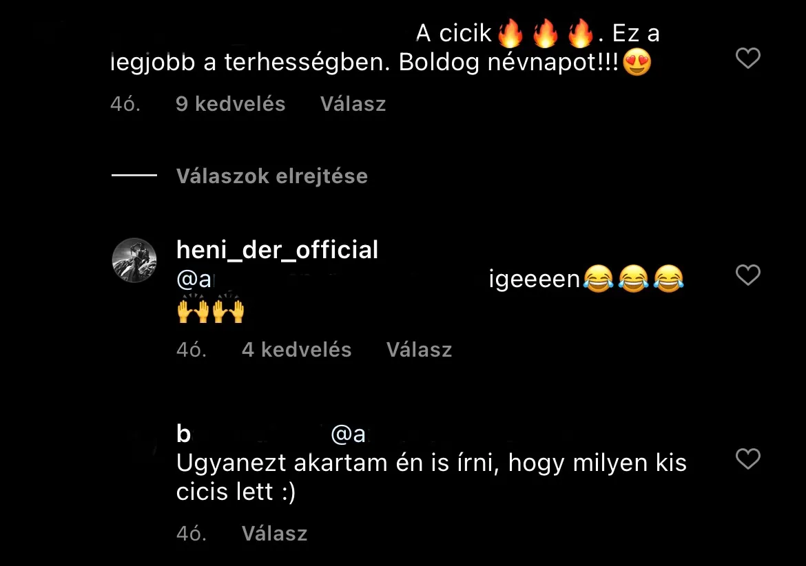 A várandós kismama legutóbbi Instagram-posztjában egy igazán szemrevaló képet mutatott a rajongóinak. A fotón jól látszik, hogy Heninek nagyobb melltartó méretre kellett váltania, és a külsejét éltető kommentek között elismeri, hogy ez az egyik legjobb dolog a terhességben.