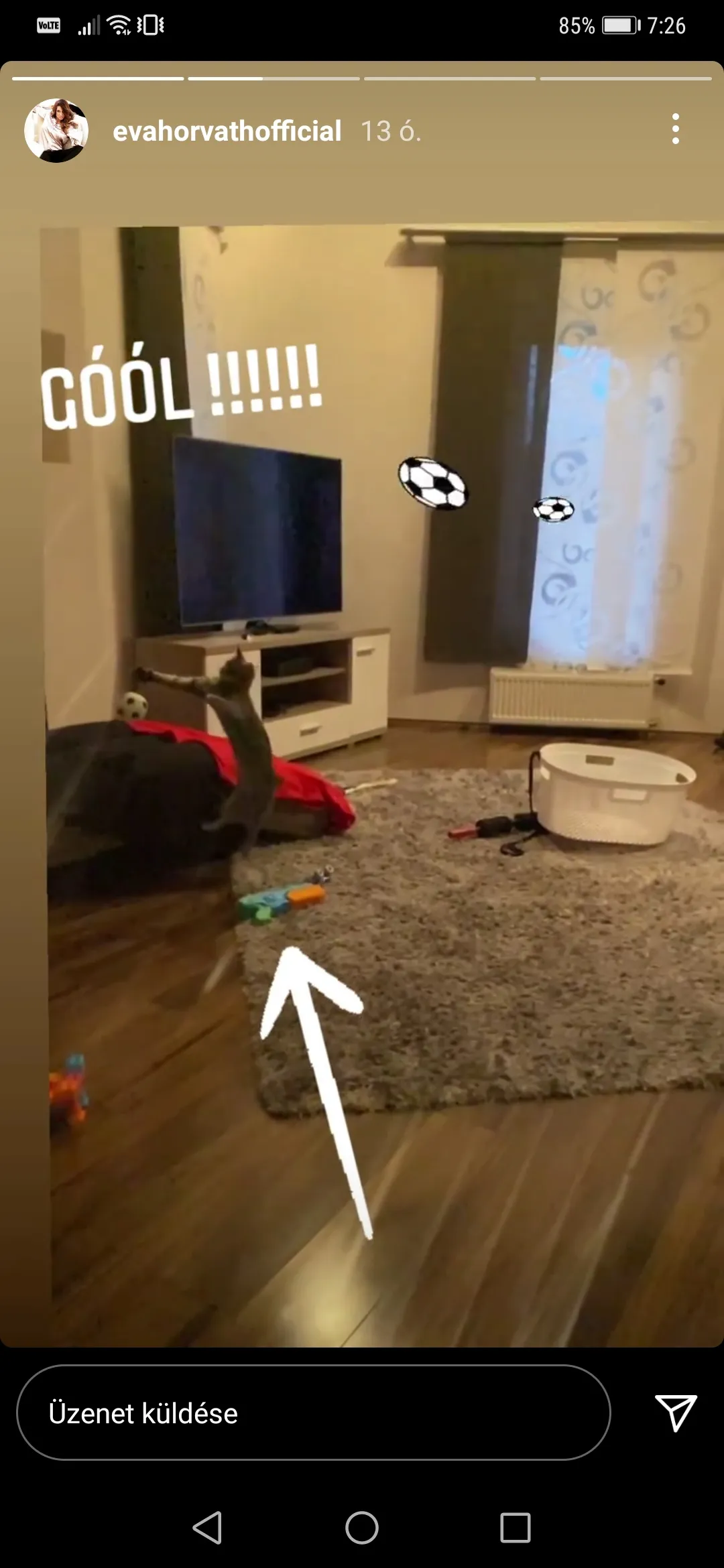 Horváth Éva macskája, ahogy általában cicák, szereti, ha játszanak vele és ha kergethet valamit. Igen ám, de a modell cicusa szó szerint focizik!