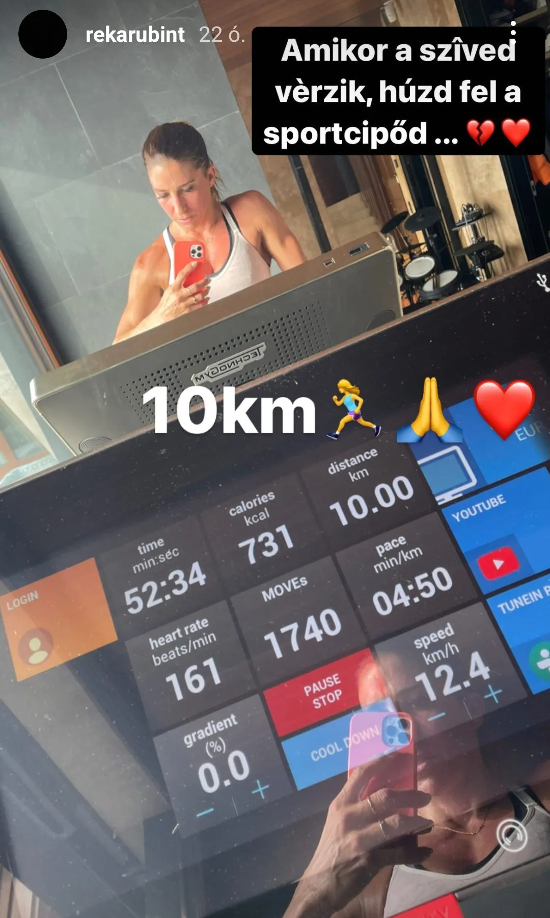 Rubint Réka, ahogy édesapja halála után, most is a sport felé fordult, hogy enyhítsen fájdalmán. Erre bizonyíték az Instagram-történetében látható egyik fotója is, amin épp a futógépen áll miután lefutott 10 kilométert. A képhez pedig, azt írta: „Amikor a szíved vérzik, húzd fel a sportcipőd...”