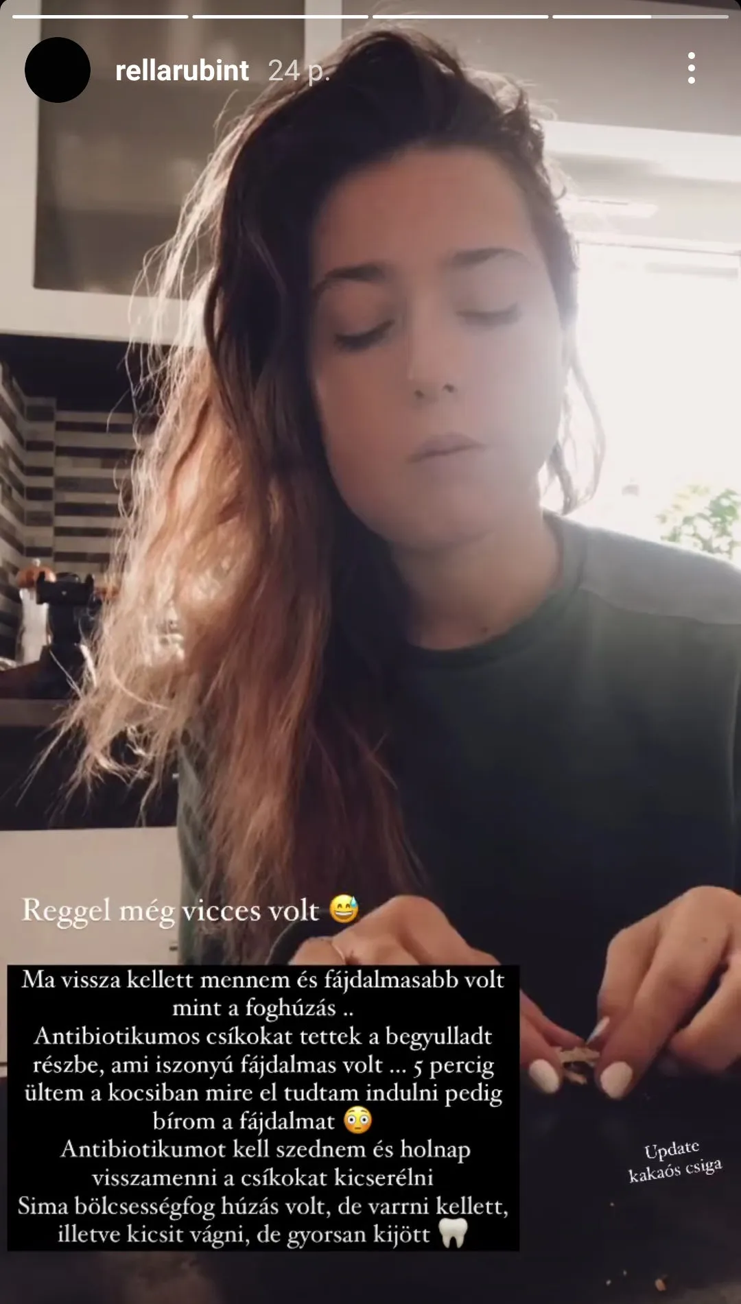 „Ma vissza kellett mennem és fájdalmasabb volt mint a foghúzás. Antibiotikumos csíkokat tettek a begyulladt részbe, ami iszonyú fájdalmas volt. Legalább 5 percig ültem a kocsiba mire el tudtam indulni, pedig bírom a fájdalmat” – olvasható Rella képe alatt.