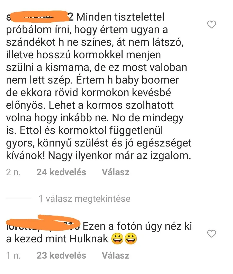 Szinte azonnal elárasztották a kommentek az oldalát. A kéretlen megjegyzésekből pedig bőven akadt. Volt, aki a körmét kritizálta, míg más az – érthető módon – bevizesedett kezére tett megjegyzést. A kismama igyekezett nem felvenni az olykor kellemetlenkedő megjegyzéseket, hiszen jelenleg már csak a kisfia születése foglalkoztatja.