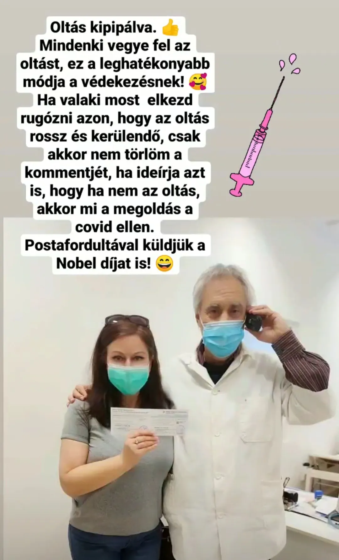 „Oltás kipipálva! Mindenki vegye fel az oltást, az leghatékonyabb módja védekezésnek! Ha valaki most elkezd rugózni azon, hogy az oltás rossz és kerülendő, csak akkor nem törlöm a kommentjét, ha ideírja azt is, ha nem az oltás, akkor mi a megoldás a Covid ellen. Postafordultával küldjük a Nobel díjat is!” – írta a képéhez.