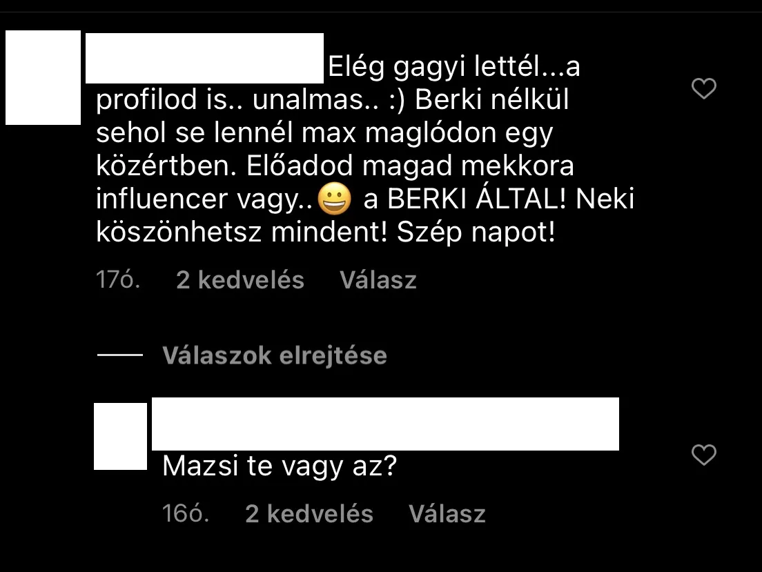 „Elég gagyi lettél, a profilod is unalmas. Berki nélkül sehol se lennél, max. Maglódon egy közértben. Előadod magad, mekkora influenszer vagy. A Berki által! Neki köszönhetsz mindent” – fogalmazott az egyik követő, akivel többen egyetértettek, de rövidesen megérkeztek Pamela „védői” is, és az ügybe rögtön belekeverték Berki feleségét, Mazsit is.