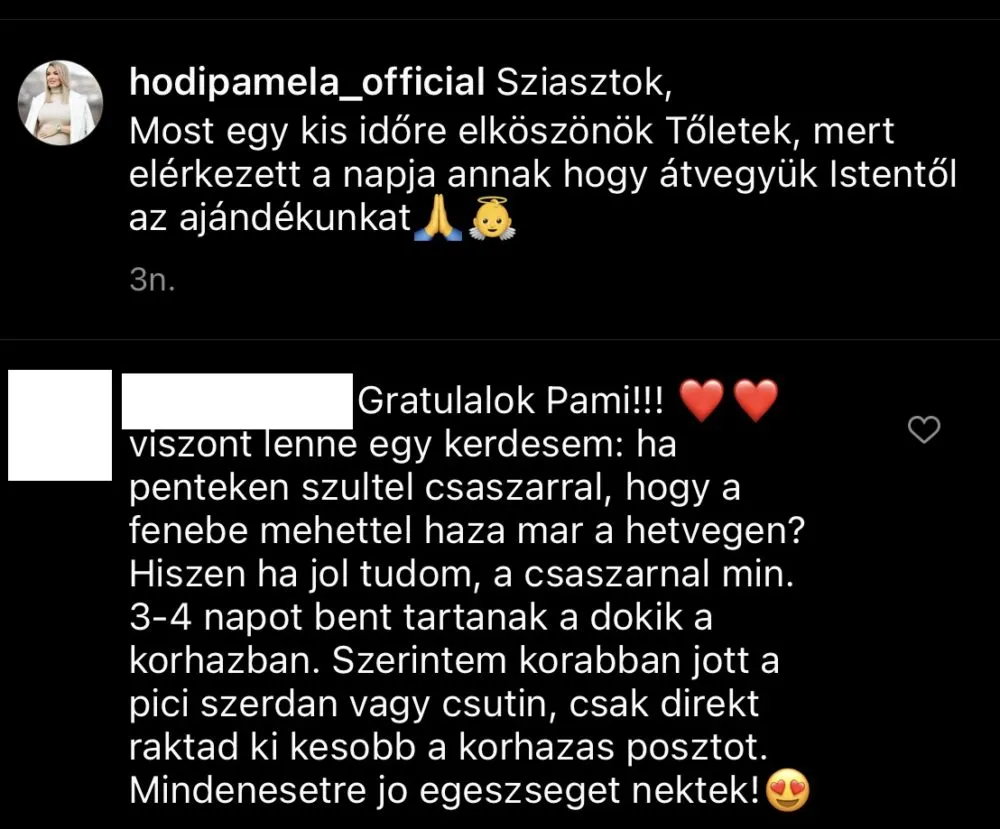 „Gratulálok Pami! Viszont lenne egy kérdésem: ha pénteken szültél császárral, hogy a fenébe mehettél haza már a hétvégén? Hiszen, ha jól tudom, császárnál minimum három-négy napot bent tartanak a dokik a kórházban. Szerintem korábban jött a pici, szerdán vagy csütörtökön. Csak direkt raktad ki később a kórházas posztot. Mindenesetre jó egészséget nektek” – fogalmazott az egyik rajongója.