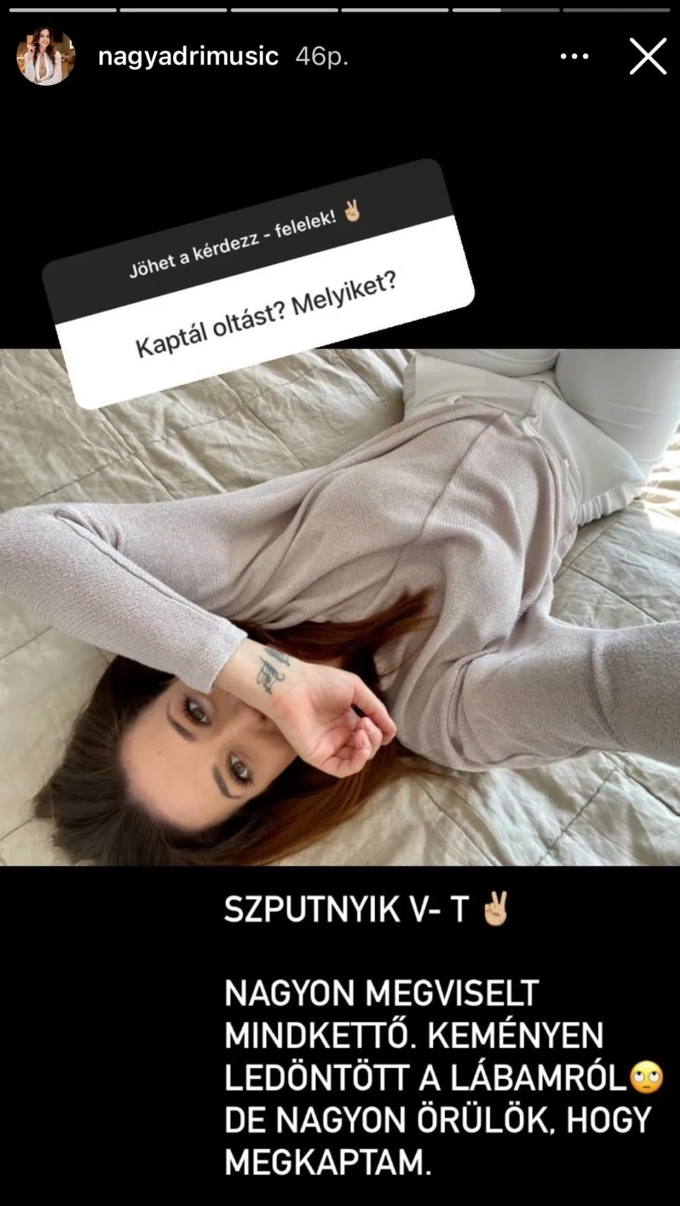 „Szputnyik V-t. Nagyon megviselt mindkettő. Keményen ledöntött a lábamról, de nagyon örülök, hogy megkaptam” – mesélte el az Instagram-oldalán az ismert énekesnő.