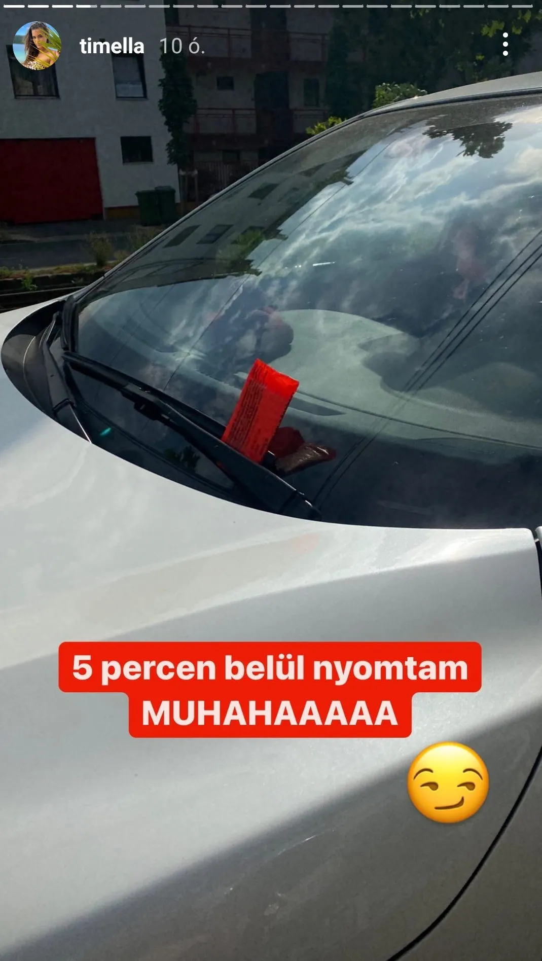 Instagram-sztorijából pedig kiderül, hogy tegnap is kapott egy drága csomagot a szélvédőjére. De Timi most reménykedhet benne, hogy nem kell fizetnie, mert az ötperces türelmi időn belül megvette a parkolócéduláját, így hiába hagyták ott neki a „mikulás csomagot”, nem vétett a szabályok ellen.