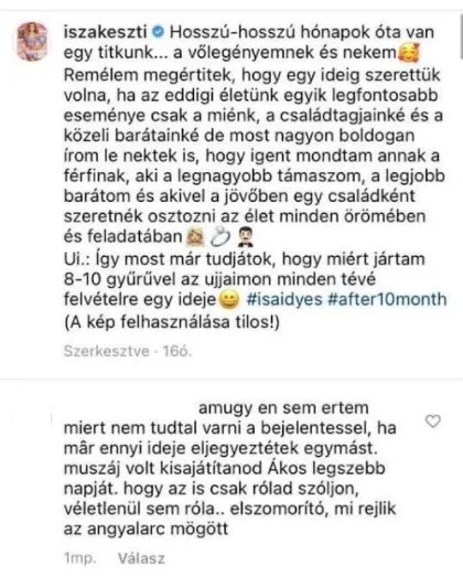 „Miért nem tudtál várni a bejelentéssel, ha már ennyi ideje eljegyeztétek egymást. Muszáj volt kisajátítanod Ákos legszebb napját, hogy az is csak rólad szóljon, véletlenül se róla? Elszomorító, mi rejlik az angyalarc mögött„ - fogalmazta meg véleményét az egyik követő.