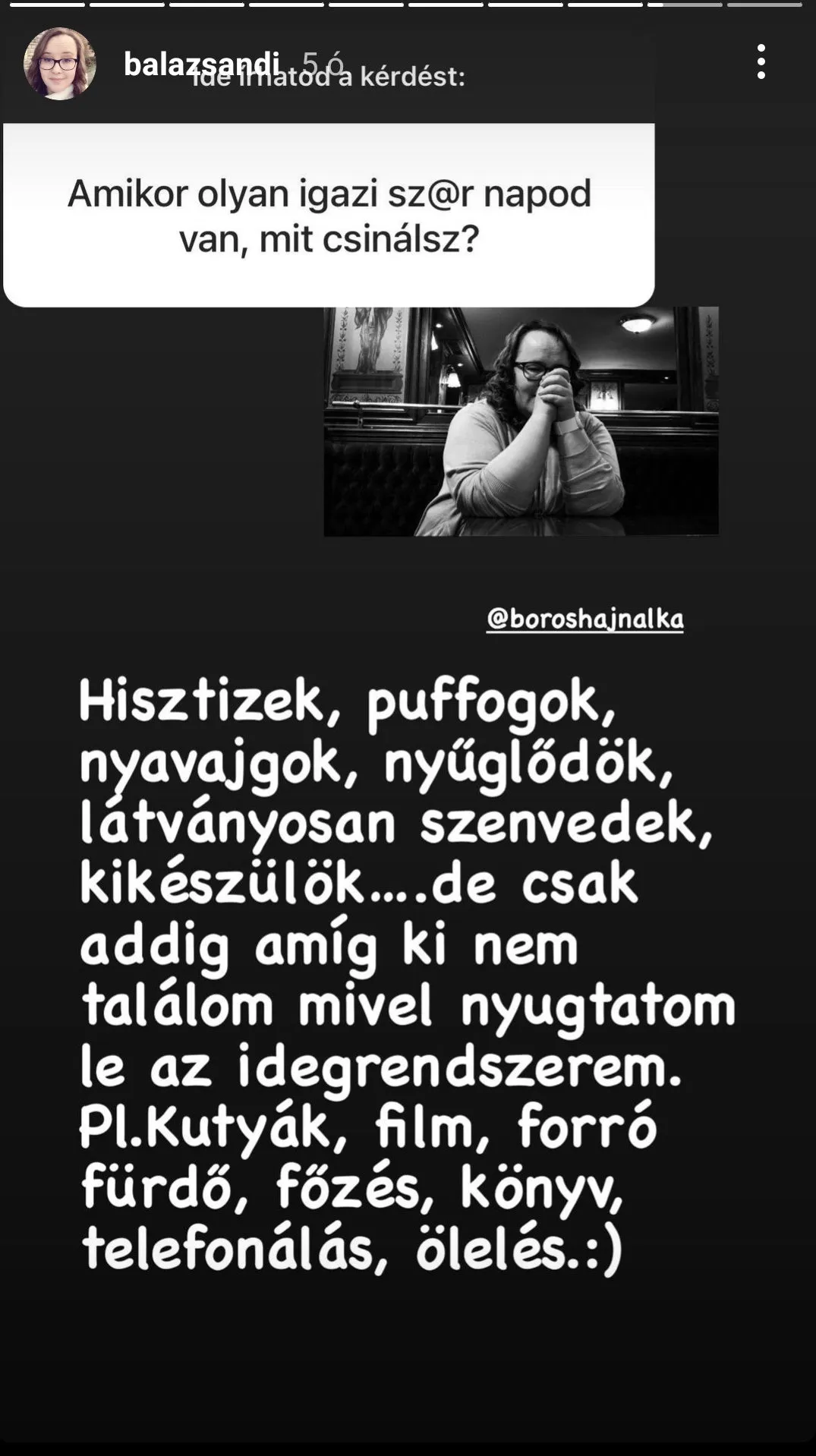 „Hisztizek, puffogok, nyavajgok, nyűglődök, látványosan szenvedek, kikészülök, de csak addig, míg ki nem találom, mivel nyugtatom le az idegrendszerem. A kutyáim társasága, film, forró fürdő, főzés, könyv, telefonálás, ölelés” – mondta Andi, aki szerencsés, hogy ennyire jól ismeri önmagát.