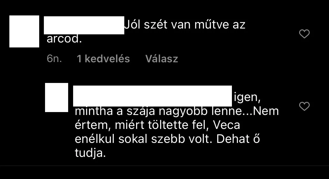 „Jól szét van műtve az arcod” – vádolta meg az egyik rajongója, akivel egyébként egy másik követő is egyetértett. Igaz, az illető szerint csupán Veca szája változott meg.