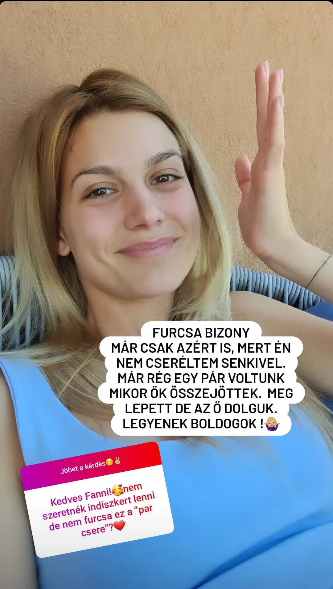 A közvélemény szerint, izgalmas és talán nem véletlen párcserére került sor, de ezidáig a siket modell nem mondta el az erről alkotott véleményét. Instagram-oldalán egyik követője egyenesen neki szegezte a kérdést, hogy nem találja-e furcsának, ezt a párcserét. Fanni nem hárított, őszintén felet.