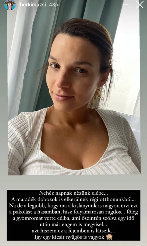 „Nehéz napnak nézünk elébe. A maradék dobozok is elkerülnek a régi otthonunkból. Na de a legjobb, hogy ma a kislányunk is nagyon érzi ezt a pakolást a hasamban, hisz folyamatosan rugdos. Főleg a gyomromat vette célba, ami őszintén szólva egy idő után már engem is megvisel. Az hiszem ez a fejemen is látszik. Így egy kicsit nyűgös vagyok” – írta ki magából a gondoltait Mazsi.