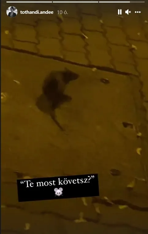 Hazafele tartott az éjszaka Tóth Andi, amikor arra lett figyelmes, hogy követik. A váratlan megfigyelő pedig egy óriási patkány volt. Az állat kicsit sem ijedt meg az énekesnőtől, bátran szaladgált mellette. De egyébként Andi sem ugrándozott sikoltozva, hogy egy patkány rohangál a lábai előtt. Sőt, inkább elővette a mobiltelefonját, hogy levideózza a rágcsálót. A felvételt aztán feltöltötte instagramos sztorijába is, amit kifotóztunk, és most meg is mutatunk.