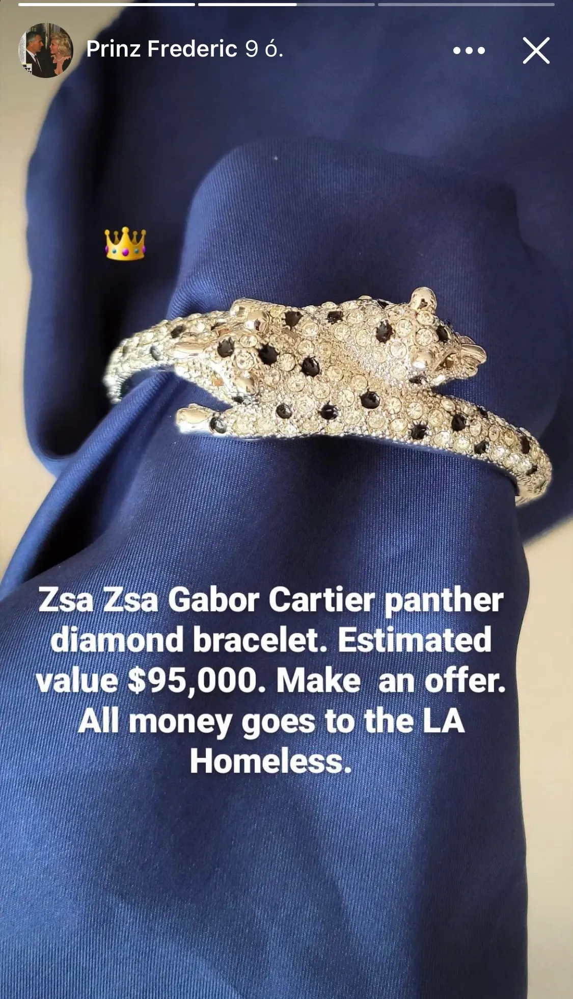 „Zsa Zsa Gabor Cartier párduc gyémánt karkötője. Becsült értéke 95 ezer amerikai dollár (azaz 31 millió 342 ezer forint). Tegyenek ajánlatot. Minden pénz a Los Angeles-i hajléktalanoknak megy” – írta Anhalt herceg, aki meg is mutatta a gyönyörű karkötőt.
