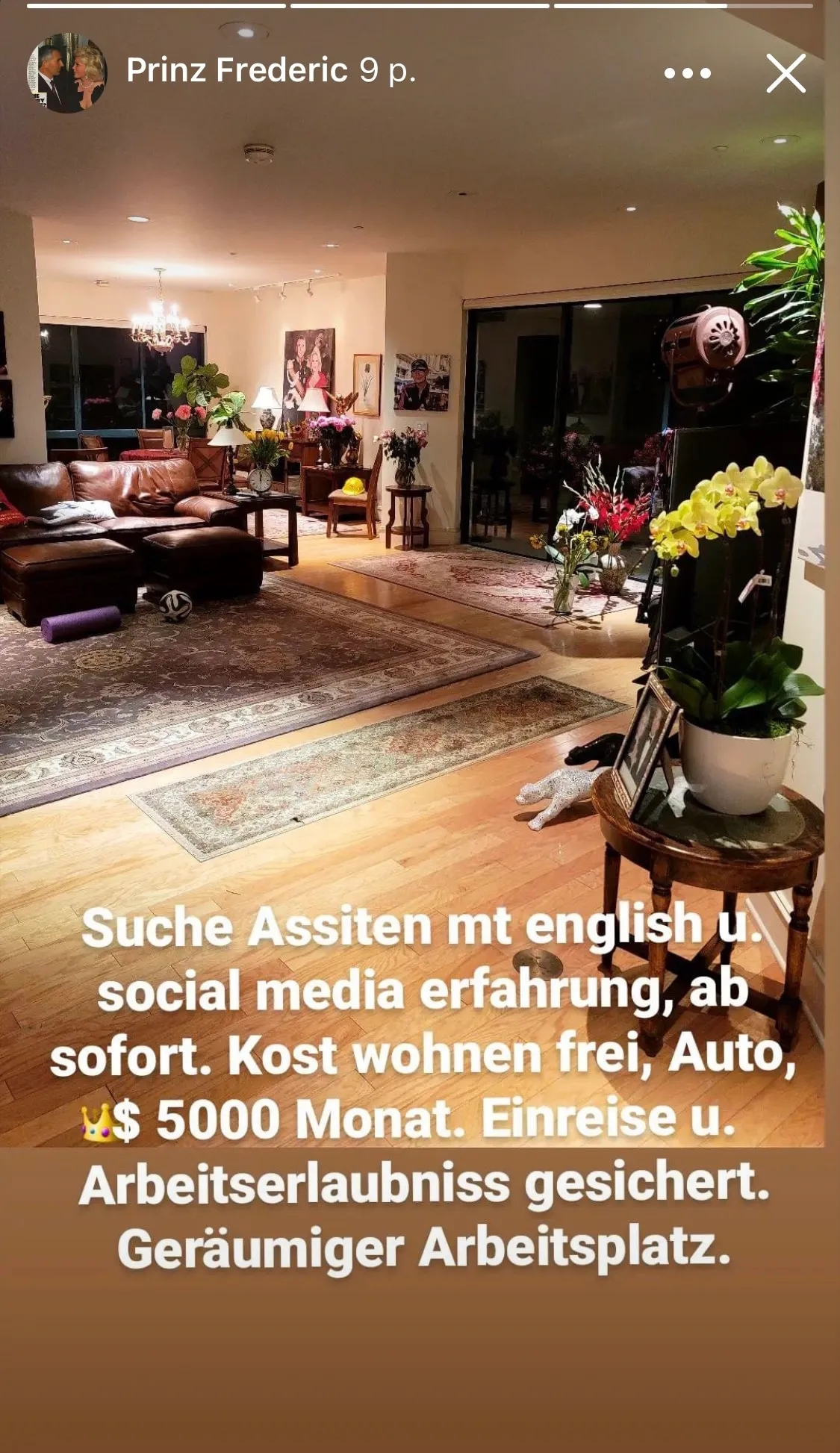 „Asszisztenst keresek, aki jól beszél angolul és jártas a social médiában is, kezdés: azonnal! Ingyen lakhatás, céges autó és 5000 amerikai dollár (azaz több mint 1,5 millió forint)” – írta hivatalos Facebook-oldalán a 78 éves Anhalt herceg, aki hozzátette, hogy biztosítja a belépést az Egyesült Államokba, és természetesen a munkavállalási engedélyt is.