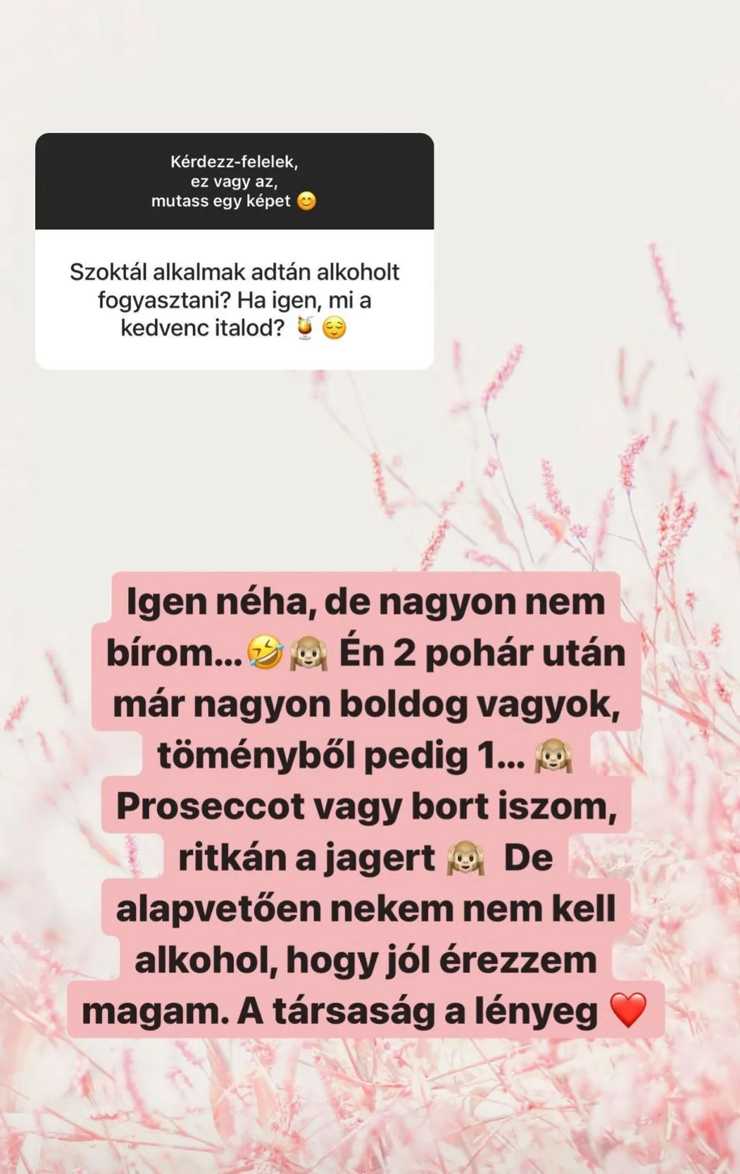 „Igen néha iszom alkoholt, de nagyon nem bírom... Két pohár után már nagyon boldog vagyok, töményből pedig 1 Proseccót vagy bort iszom, ritkán Jagert, de alapvetően nekem nem kell alkohol, hogy jól érezzem magam. A társaság a lényeg” - írta Gelencsér Timi.