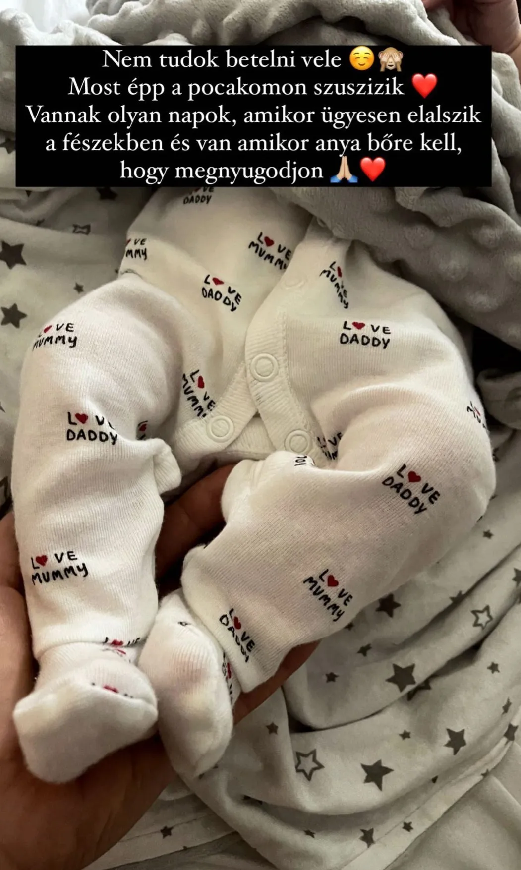 „Nem tudok betelni vele! Most épp a pocakomon szundizik, de vannak olyan napok, amikor ügyesen elalszik a fészekben és van, amikor anya bőre kell, hogy megnyugodjon” – írta a büszke édesanya az Instagram-oldalán.