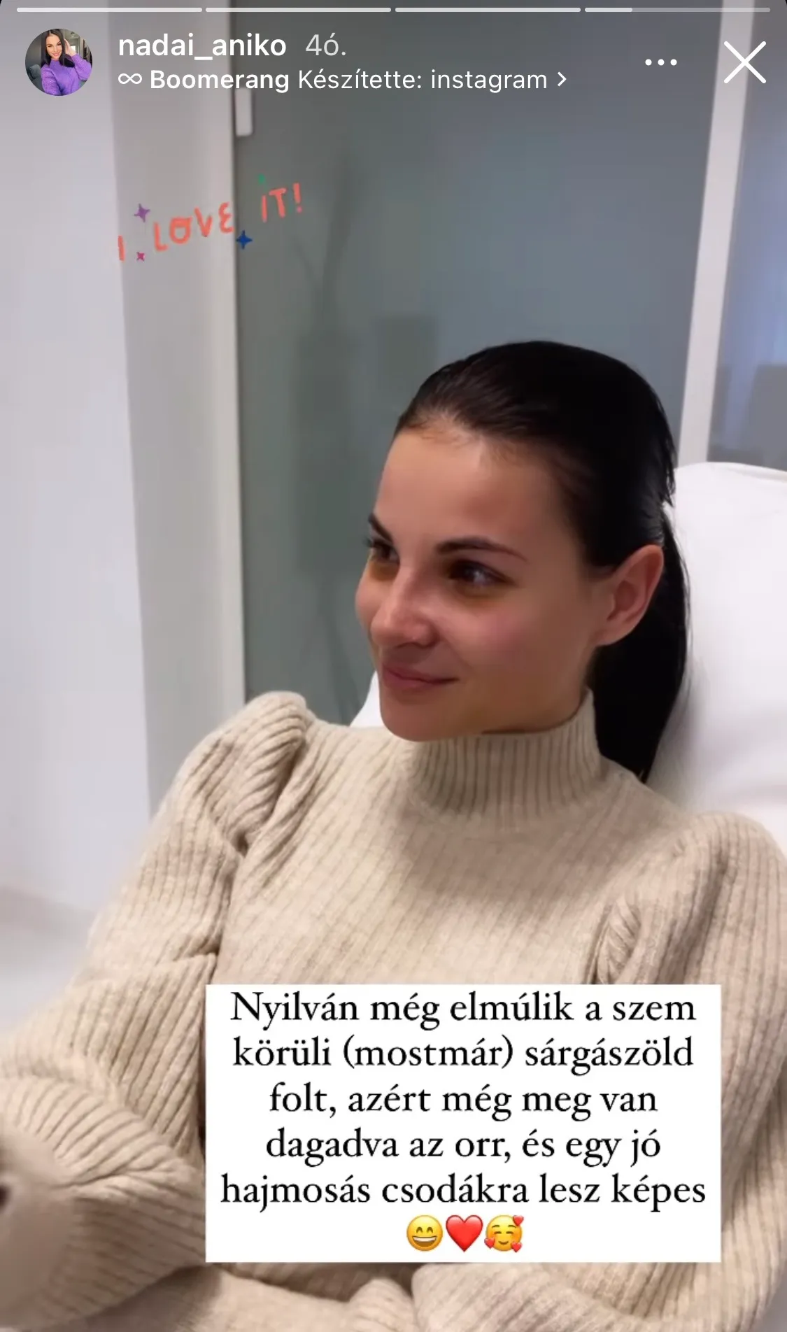 „Nyilván még elmúlik a szem körüli (most már) sárgászöld folt, azért még meg van dagadva az orr, és egy jó hajmosás csodákra lesz képes” – fűzte instagramos sztorijához Anikó, aki megmutatta új orrát a rajongóinak is.