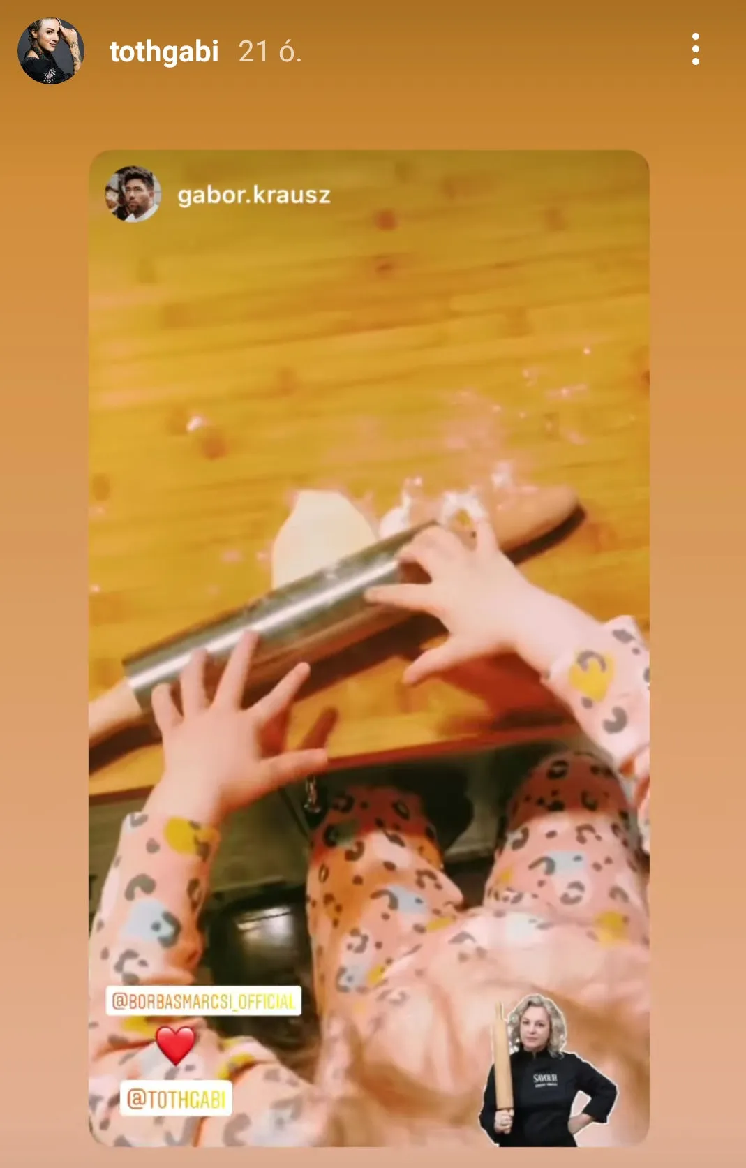 Egy biztos, a szülőktől sokat tanul, és nemrég a pöttömlány nyújtófával dolgozott a konyhában. Tóth Gabi kislánya ügyesen nyújtotta a tésztát és kisütötte a saját süteményét. Akárcsak a séf apukája, Krausz Gábor.