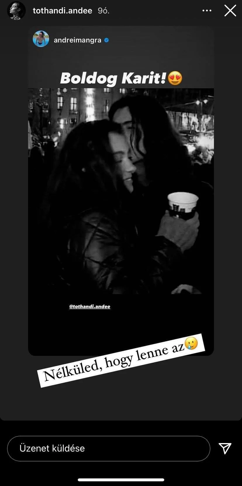 Bár a fiatal énekesnő úgy tűnik, nagyon jól érzi magát idén karácsonykor, valami talán mégis hiányzik neki – vagy valaki. Andrei Mangra Insta-sztoriban kívánt boldog karácsonyt Andinak egy közös fotóval, amin Andrei egy puszit ad az énekesnőnek. Erre Andi megosztotta Insta-sztorijában a táncos posztját, és azt írta hozzá: „Nélküled hogy lenne az„. Andi még egy szomorú, sírós smileyt is tett hozzá, nyomatékosítva, hogy sajnálja, hogy nem lehet vele a férfi.