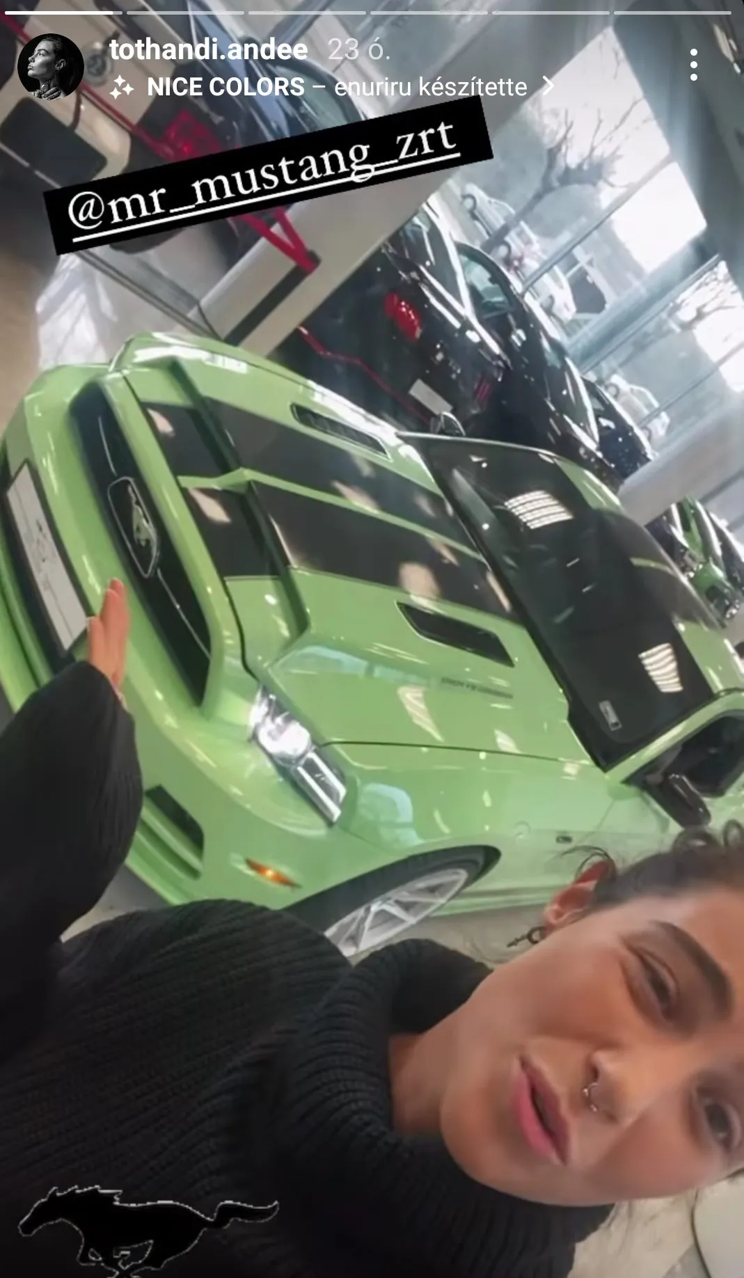 „Megvan a karácsonyi, az újévi és a születésnapi ajándékom egyben, mert én is kapok egy autót. Mondtam, hogy Mustangot szeretnék és Mustangom lett”- jelentette be az Instagram-oldalán.