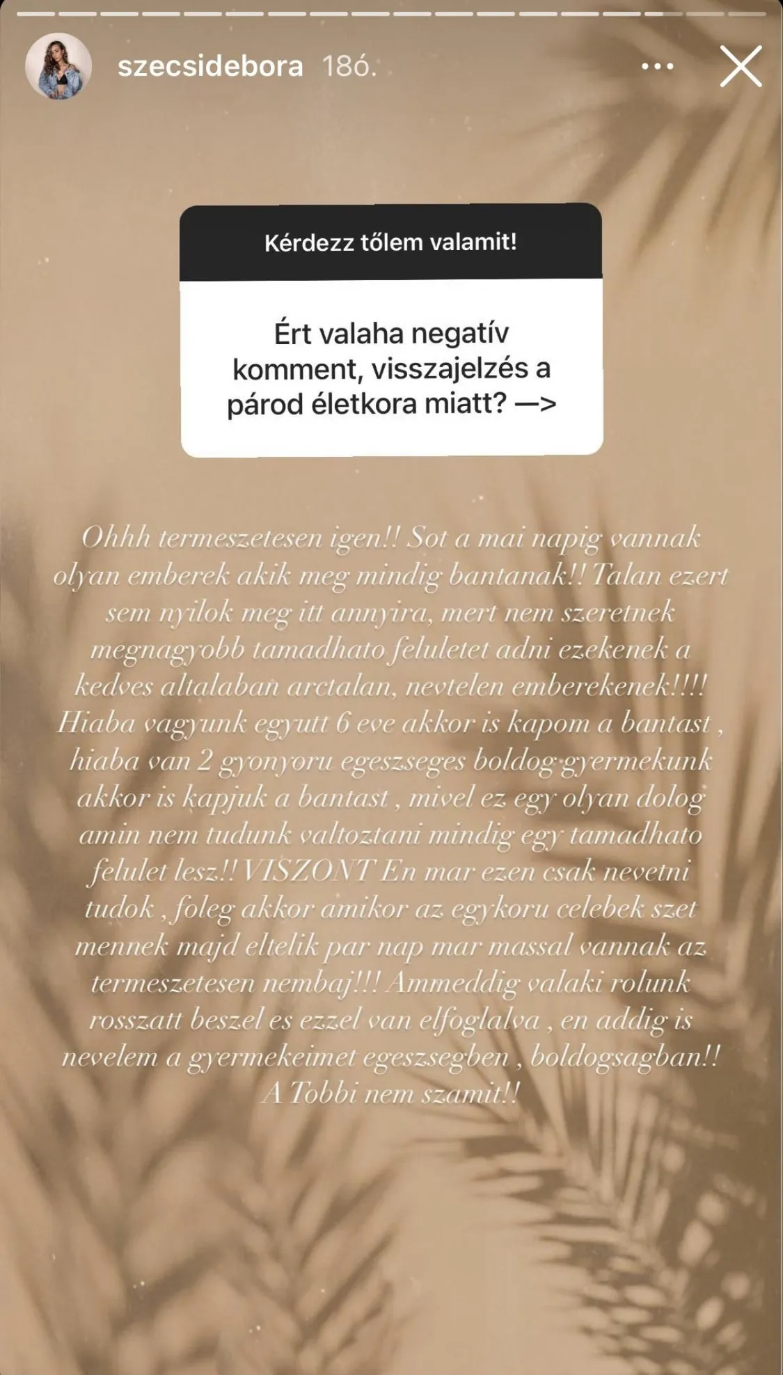Cookyt és menyasszonyát a mai napig támadják a gonosz internetezők a köztük lévő nagy korkülönbség miatt. Mint ismeretes, Debóra 27 évvel fiatalabb a rádiósnál, de ennek ellenére is hatalmas az összhang közöttük, és nagyon boldogok együtt immáron hat éve. Ez idő alatt pedig két közös gyermekük is született. Debóra most az Instagram-oldalán mondta el egy rajongói kérdésre, hogy hiába igazolja őket az idő, sokan még most is bántják őket.