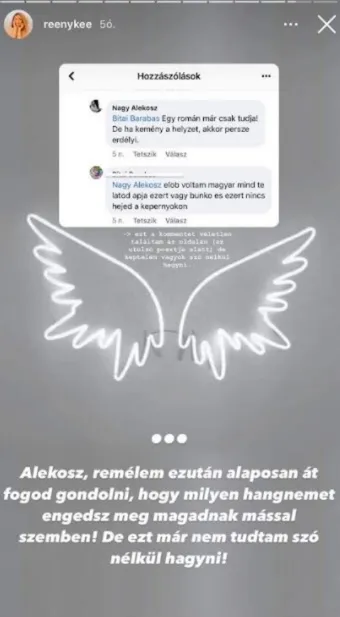 "Azt kívánom, mihamarabb találja meg azt a lelki békét, amit bennem próbált megsemmisíteni. Remélem, ezután alaposan átgondolod, hogy milyen hangnemet engedsz meg magadnak mással szemben! De ezt már nem tudtam szó nélkül hagyni" - írta Reni.