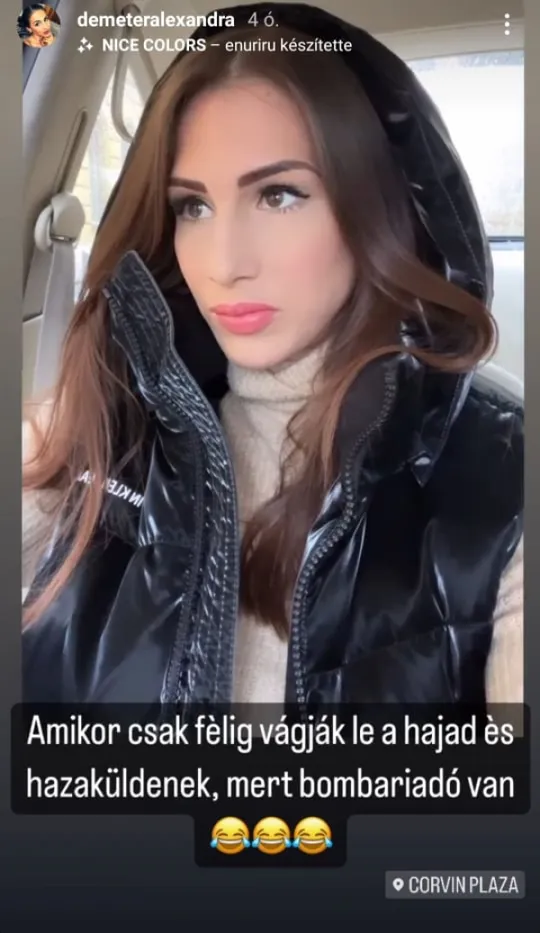 A dögös gyógyszerész, Demeter Alexandra kedd délután a budapesti Corvin Plázába tért be egy kis frizura igazításra, megelehetősen gyanútlanul. Ez persze érthető, hiszen honnan kellett volna tudnia, hogy hamarosan bombariadót jelentenek be, és azonnal el kell hagynia az épületet.