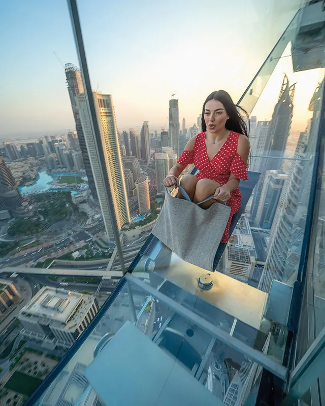 A főváros legújabb látványosságán egy 220 méter magas szálloda tetején, egy teljesen átlátszó falú csúszdán lehet lesiklani, valamint - biztonsági rögzítéssel - a nyitott legfelső emelet peremén körbesétálni és gyönyörködni többek között a Burj Khalifára és a szökőkutakra nyíló panorámában.