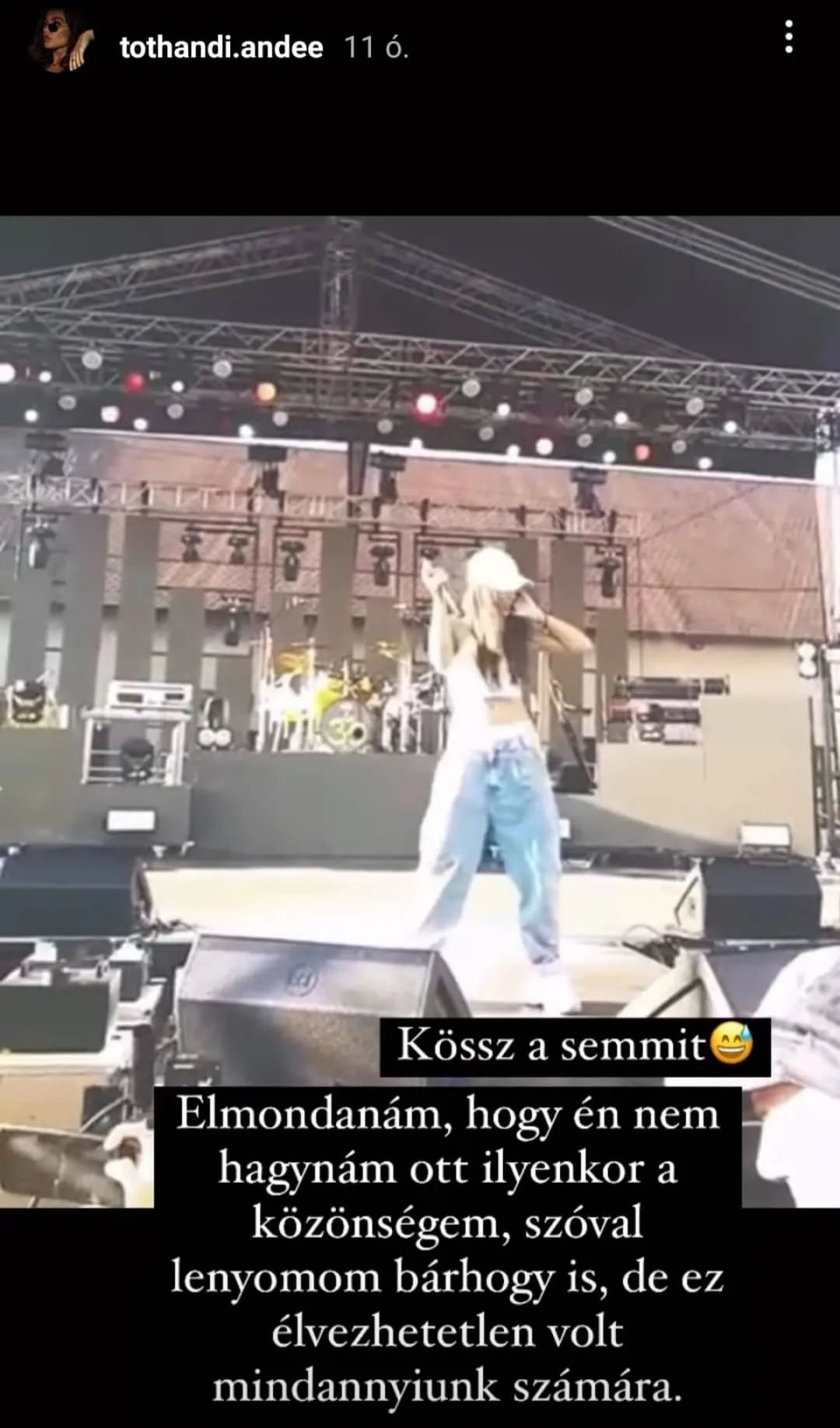 "Nagyon szégyellem, ez van. Mentségemre szóljon, hogy nem az én hibám. Kib*szott szar volt a hangosítás, sz*rt sem hallottam. Végig ideges voltam, káromkodtam, csoda, hogy nem b*sztam be a mikrofont a közönségbe, szóval nagyon sajnálom" - magyarázta Andi, majd egy videót is közzétett a kifogasolható fellépésről.