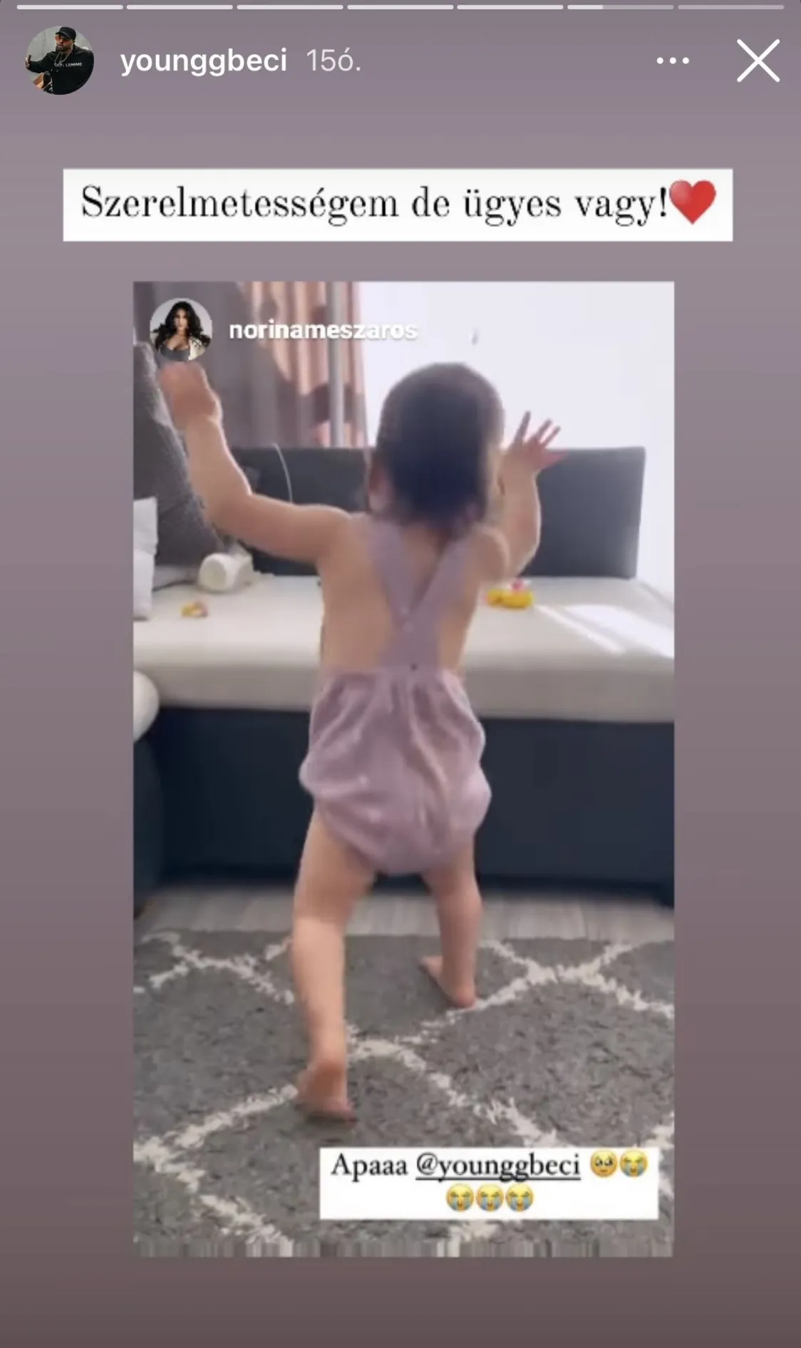 Megtette az első lépéseit Young G Béci és felesége, Norina első közös gyermeke. A 15 hónapos Rebeka gyönyörűen fejlődik, aminek a szülők nagyon örülnek. A büszke édesanya otthonukban készített felvételt a kislány első lépéseiről, amit aztán átküldött az apukának is, majd mindketten megosztották a felvételt instagramos sztoriban.