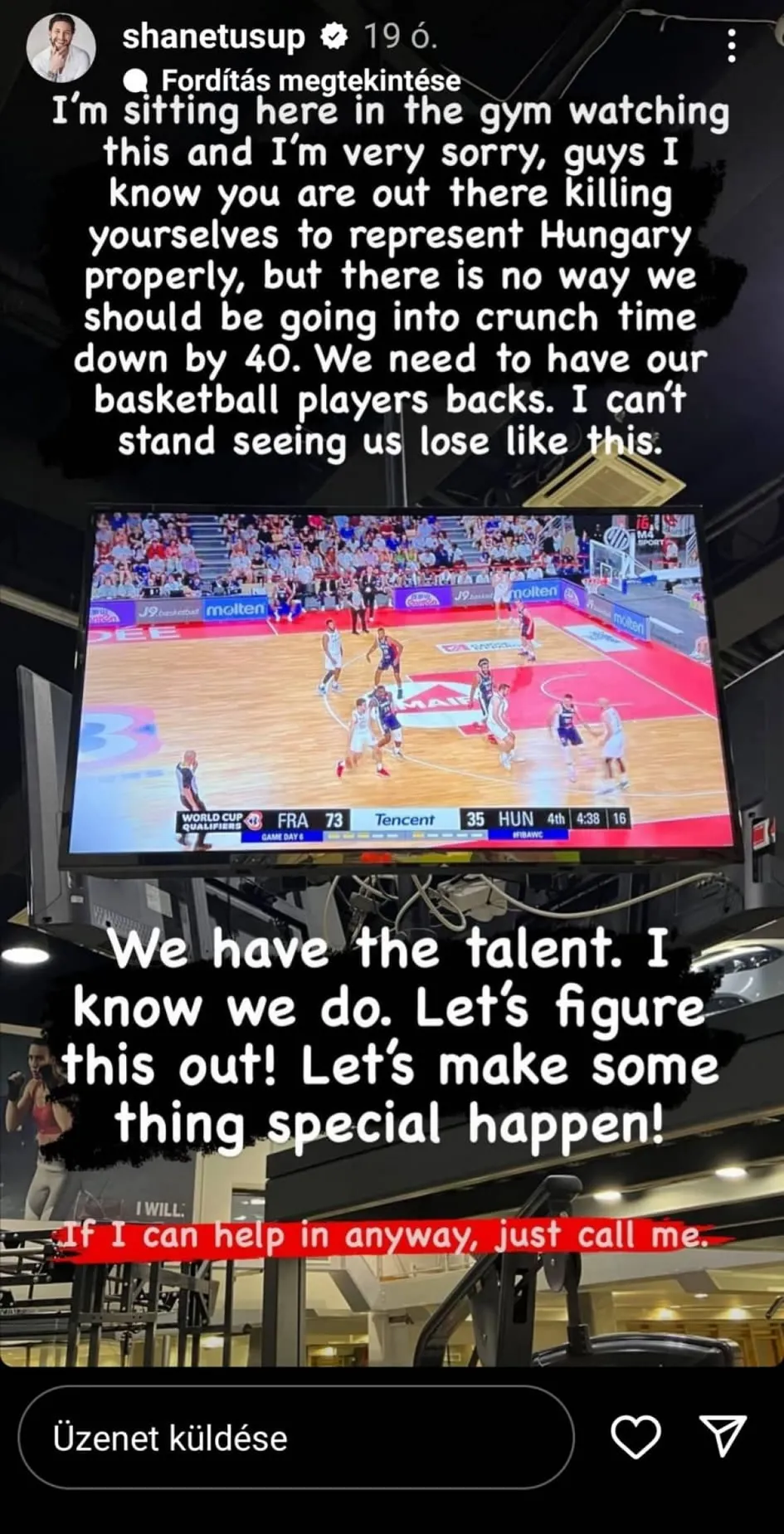 "Nézni se bírom, hogy így kikapnak a srácok. Bennünk van a tehetség. Biztosan tudom. Találjunk ki valamit, hogy valami igazán különleges dolog történhessen" - írta nagy lelkesen Tusup, magabiztosan hozzátéve, hogyha a profi kosarasoknak szükségük van esetleg bármilyen tanácsra, szakmai segítségre, akkor feltétlenül hívják őt bizalommal.
