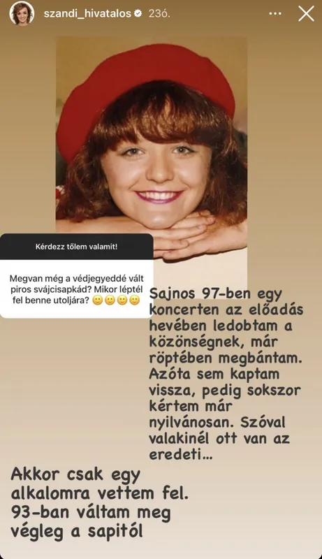 Azt kijelenthetjük, hogy Szandi védjegyévé vált az a bizonyos piros svájci sapka, melyben berobbant az énekesnő a köztudatba. Szandi egyik rajongója fel is tette hát a nagy kérdést, hogy megvan-e még a relikvia, azonban elszomorító válasz érkezett.