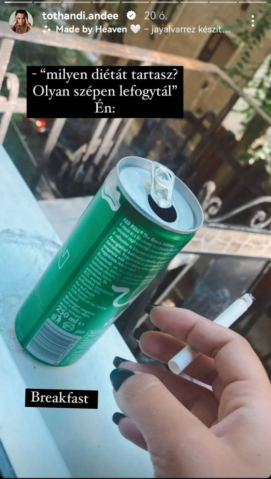 Sőt, nem csak, hogy elárulta, de fotóval illusztrálta, így derült ki, hogy Andi cigarettát és energiaitalt fogyaszt reggelire.