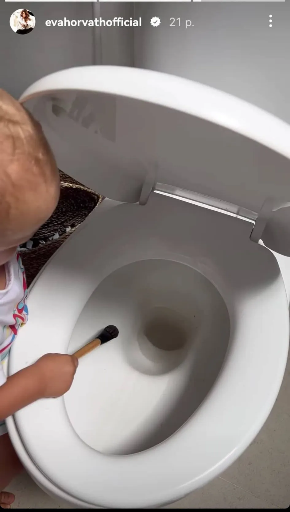 Történt ugyanis, hogy Alex elszórakoztatta magát és anyukája sminkes ecsetével pepecselt egy kicsit a vécécsészében. Éva sokkot kapott amikor meglátta, de azt biztosan tudta, hogy az arcát már nem szépítheti többet az ecsettel, újat kell venni. Ennyi baj legyen, de legalább már most látszik, hogy Alex egy eleven kisgyerek.
