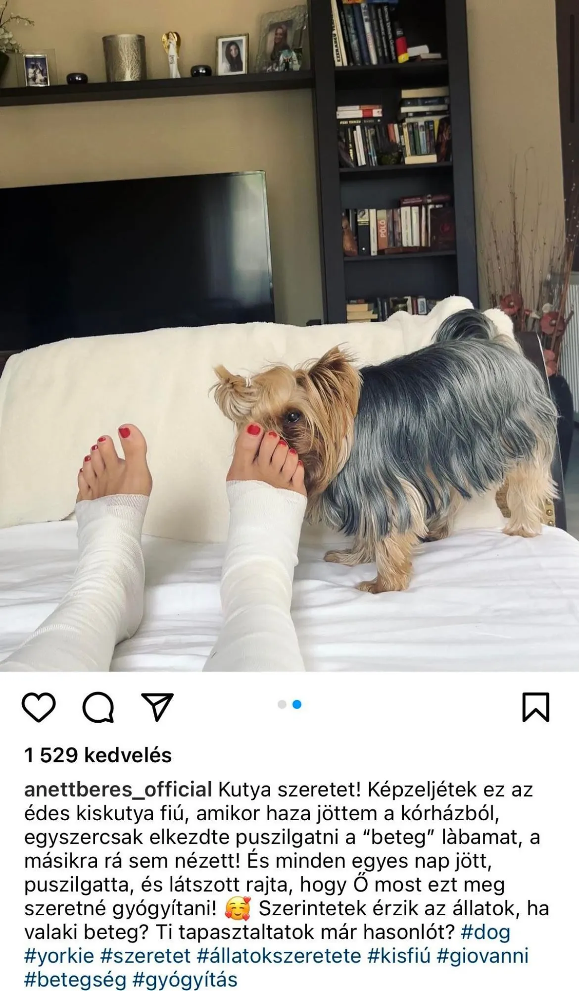 Ő nem más, mint Anett kiskutyája, aki a kórházból hazaérkezés óta próbálja gyógyítani. Instagram bejegyzésében elmesélte, hogy a "beteg" lábát minden nap puszilgatja.