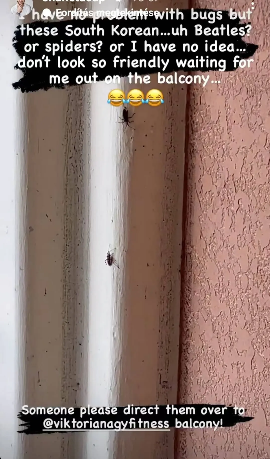 "Nincs bajom ezekkel a dél-koreai....bogarakkal....vagy pókokkal? Igazából fogalmam sincs, de nem tűnnek túl barátságosnak, ahogy itt várnak rám az erkélyen" - humorizált az állatvilág iránt érdeklődő edző, majd kijelentette, reméli, hogy a lények átrepülnek inkább Nagy Viktória erkélyére.
