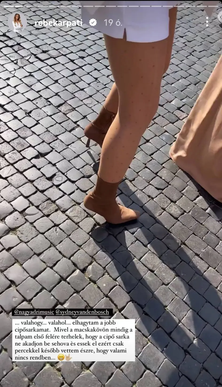 Instagram-oldalán azt mondta, a macskakövön lépdelve, nem is érzékelte, hogy elhagyta a tűsarkot. Nos, hát mindenki úgy kirándul ahogy tud, vagy akar, de egy biztos, Rebeka ezután újcipőre váltott és folytatták a bulis látogatást.