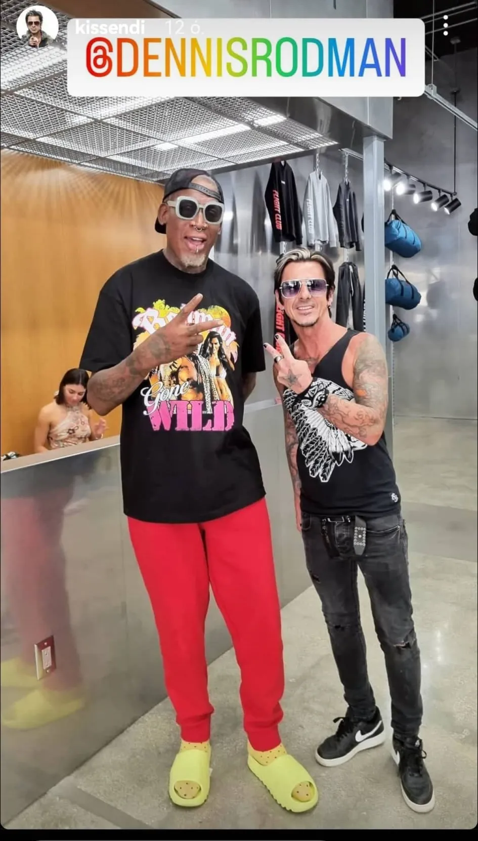 A Hooligans dobosa a turnék során nem csak dolgozik, de ilyenkor képes igazán kikapcsolódni is. Az egyik üres órájában pedig most egy világsztárral is összefutott. S ha már ekkora szerencséje volt, gyorsan lőtt is egy közös fotót Dennis Rodmannel. Az amerikai fenegyerek örömmel pózolt Kiss Endi mellett – és ahogy láthatjuk, az óriási kosaras mellett a magyar dobos sem törpül el.