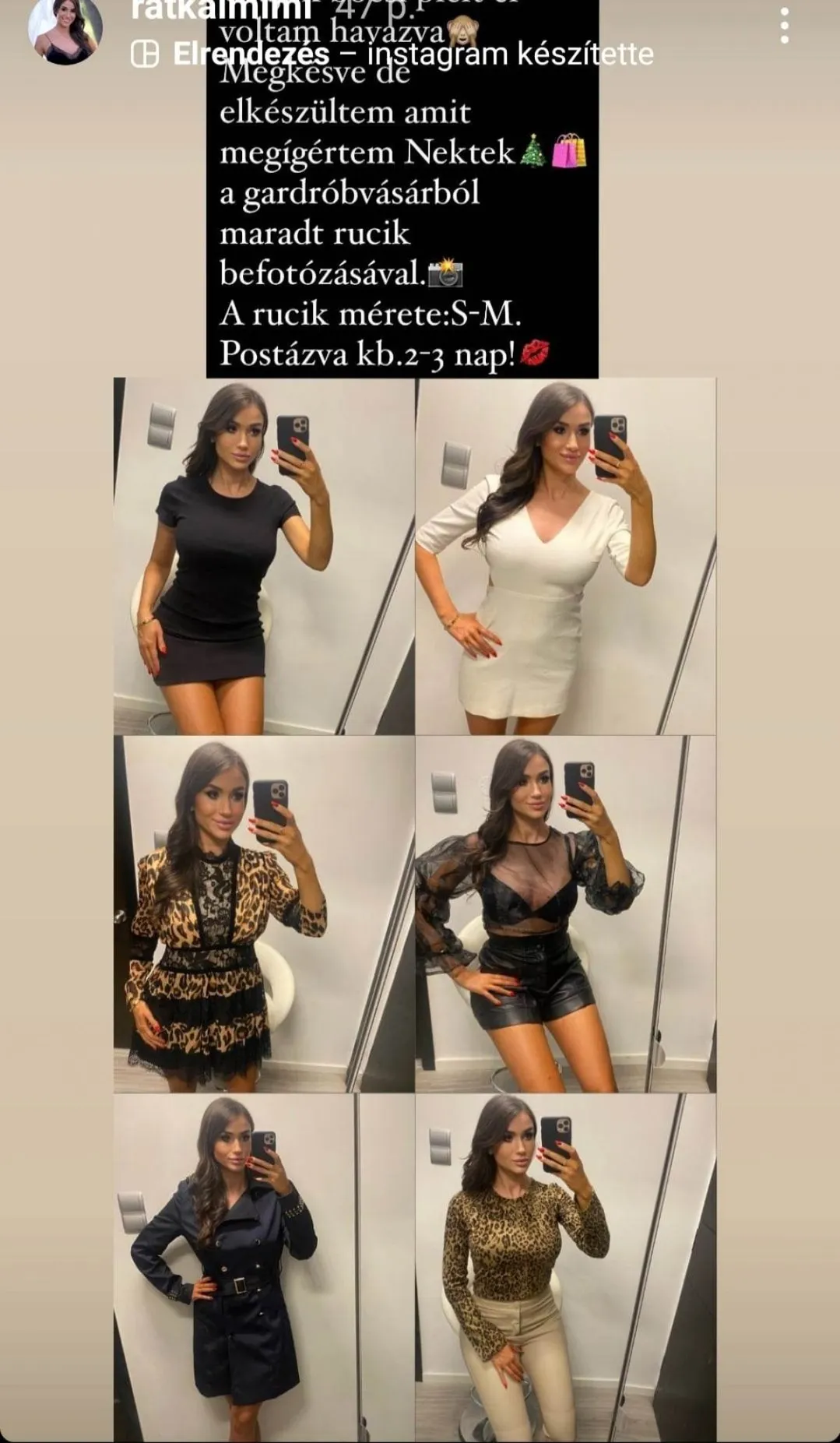 A ruhákról annyit kell tudni, hogy S-M méretűek, és Mimi postázza is azokat a szerencsés új tulajdonosnak.