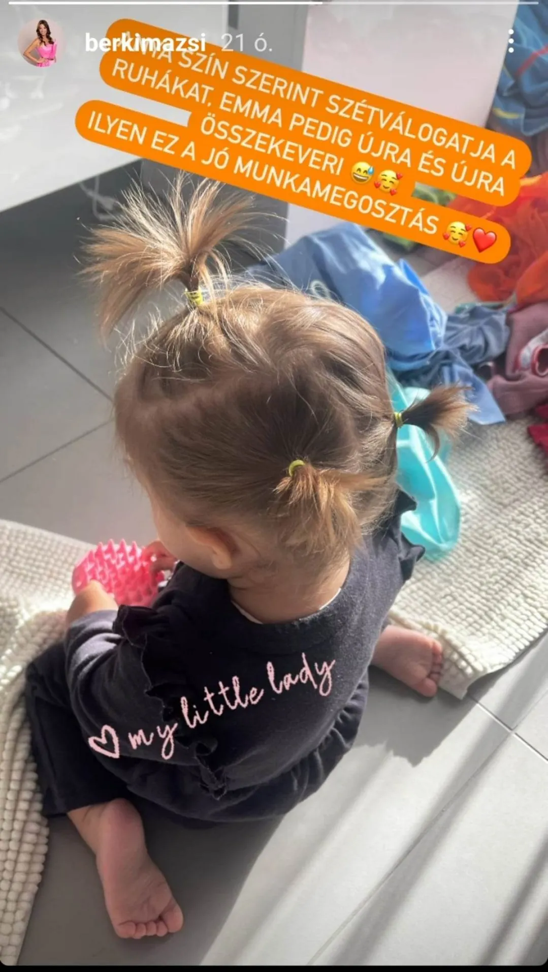 Rendszeresen oszt meg róla fotókat is a közösségi oldalakon, igaz, arra mindig gondosan ügyel, hogy a kislány arca ne látszódjon. Most épp abba avatta be a követőit, hogy Emmácska egyik kedvenc hobbija, hogy a precízen, szín szerint összeválogatott ruhákat újra és újra összekeveri.