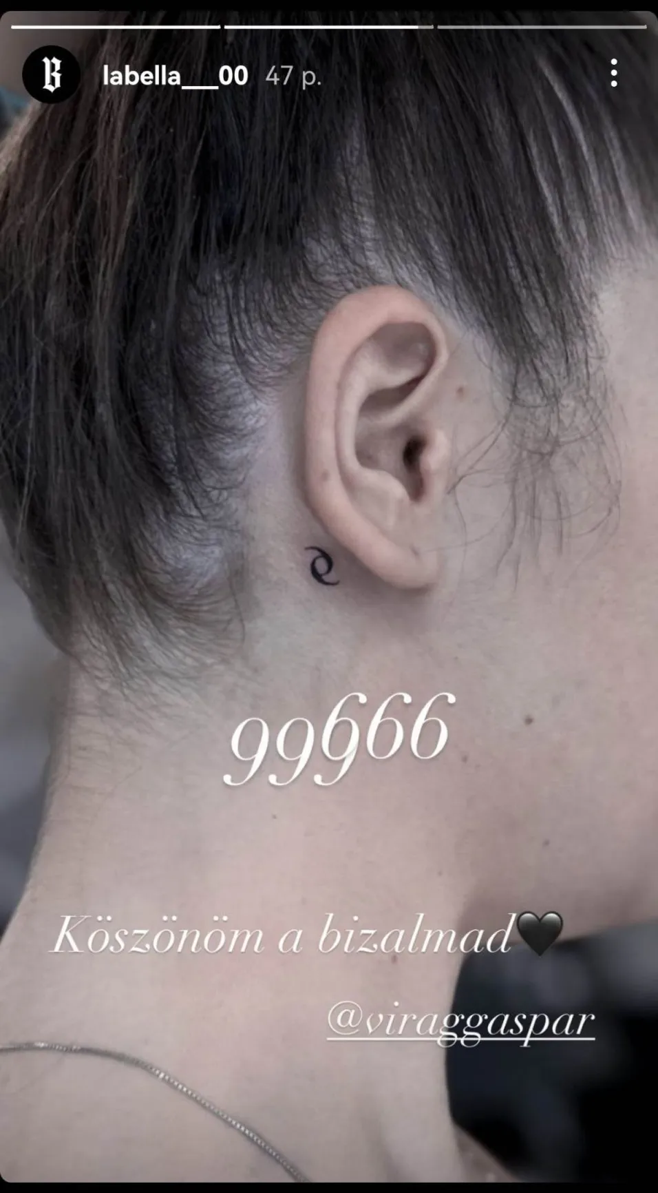 A csinos fiatal lány füle mögé az angyalt és ördögöt szimbolizáló – 999 és 666 – számsor összevonásából készült egy varrás, míg egy sokkal inkább látható helyre, az alkarjára angyalszárnyak és egy glória került, talán azért, hogy az angyali viselkedés, jótettek végrehajtására ösztönözze őt.