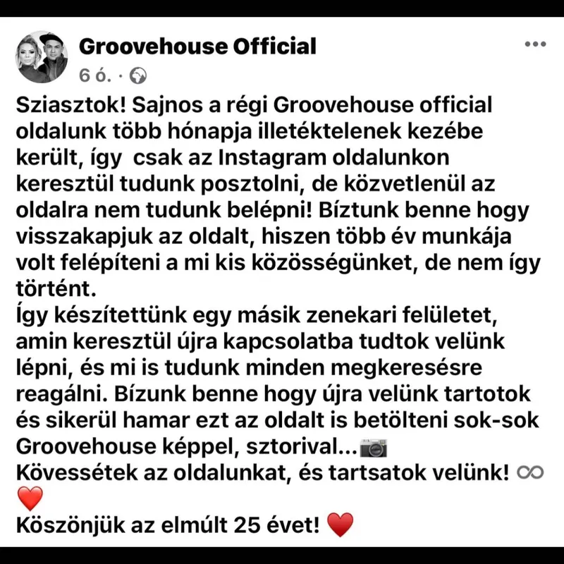 Szombat este adta hírül a Groovehouse együttes két tagja, Judy és Zsolti, hogy illetéktelenek kezébe került a Groovehouse 25 nevű Facebook-oldaluk, melyhez most már nincs hozzáférésük. A rajongókat a két zenész igyekszik minden más platformon értesíteni erről. A probléma a lehető legrosszabbkor jött, hiszen november 11-én, szombaton lépnek színre a 25. jubileumi koncertjükkel az Akvárium nagytermében. A jegyek ugyan jól fogynak, így valószínűleg telt ház lesz, de ha valami változás állna be, arról lehet, hogy nem értesülhet mindenki, akit érdekel.